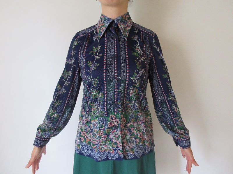 レトロムードのあるネイビーにお花柄が個性的なヴィンテージシャツ。