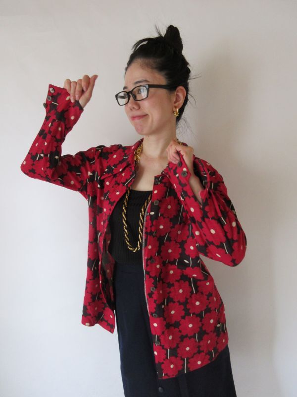 【伸縮性も嬉しい*】レトロポップなフラワー柄シャツ