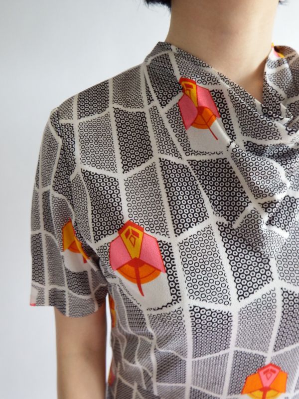 レトロ度満点の柄生地なのでさらりと1枚で着てバッグや小物、アクセサリーで変化を楽しんで下さいね^^