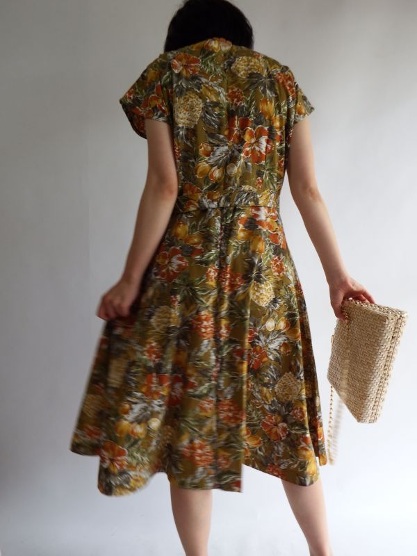 パイナップルに木の実やお花の柄が南国ムードなヴィンテージワンピースです♪