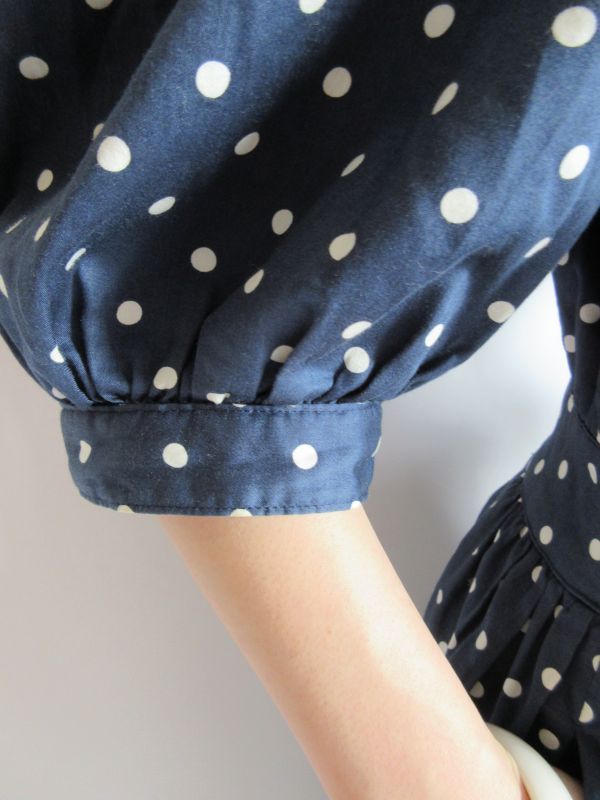 上品ネイビーに白の水玉、そしてパフスリーブが大人可愛いワンピース!