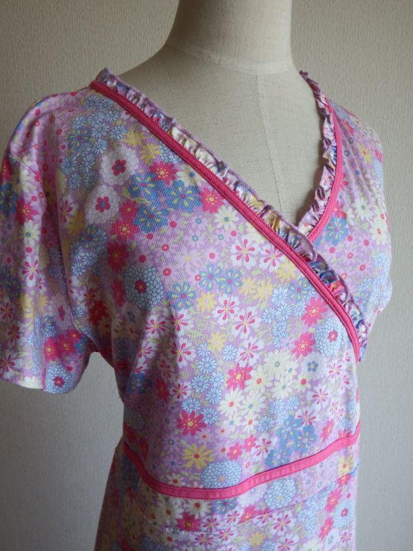 ゆったりOK*花柄マキシ丈ワンピ [OK-39] ゆったりOK*花柄マキシ丈ワンピ [OK-39] お問い合わせ お気に入り登録 優しいカラフルな色合いと柄デザインが可愛いマキシ丈ワンピースです♪当時はお部屋着だったのでしょうか?レースのカーディガンと麦わら帽子でコーデして夏の乙女スタイルはいかがでしょうか^^ サイズ* 着丈125、肩幅44、袖丈17、身幅56、バスト112、ウエスト100(リボンで小さく調整できます)、裾幅81 素材*伸縮性 表地コットン 裏地なし 着用時の伸縮性あり 生産国* 日本製だと思われます コンディション*古着にご理解ある方でしたら喜んでいただけるいいコンディションです。 他の写真