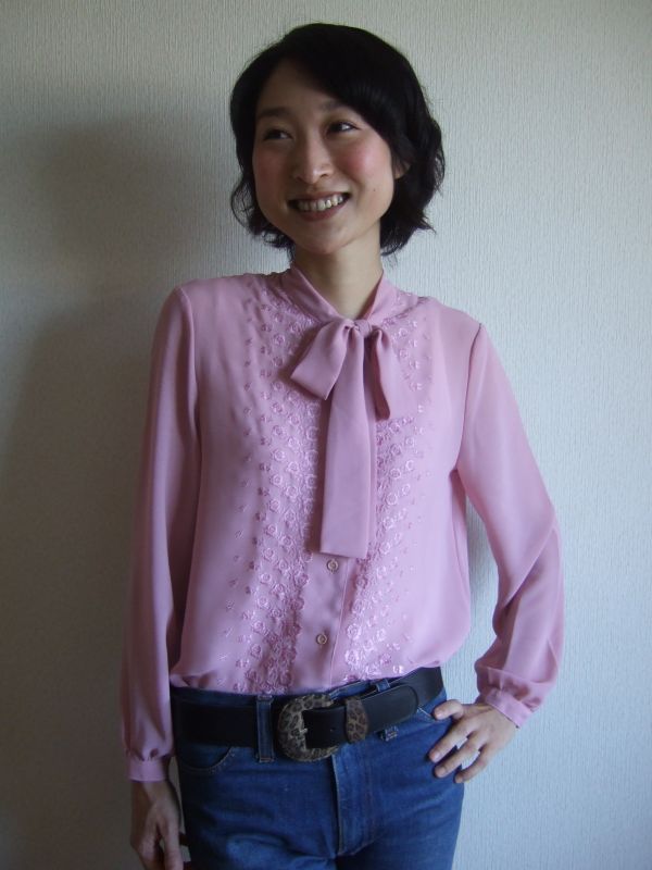 お花刺繍棒タイリボンブラウス [SP-47] お花刺繍棒タイリボンブラウス [SP-47] お問い合わせ お気に入り登録 大人可愛いお花刺繍と色合いが素敵なヴィンテージブラウスです♪ スカートでもデニムでも品のあるスタイルに仕上がります!!! 落ち着いたお色のピンクが美しい1枚です。 サイズ* 着丈62 肩幅38 袖丈57 身幅46 バスト92 裾幅47 素材*伸縮性 ポリエステル100% 着用時の伸縮性なし 製造国* 日本製 コンディション* 古着にご理解ある方でしたら喜んでいただけるいいコンディションです。 モデルサイズ*身長162cm 他の写真